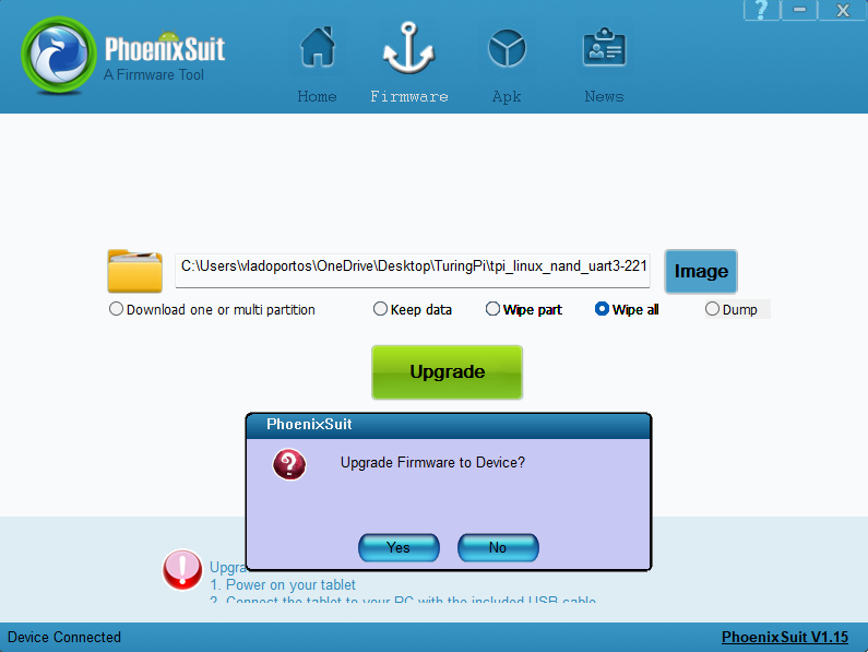 Firmware in version 2.x overhauls the flashing method and how the images are built. We drop the dependency on Phoenix Suit, but this also means we cannot use either Phoenix Suit or the original (contained in the firmware version 1.x) OTA updates to perform the upgrade from version 1.x to 2.x.